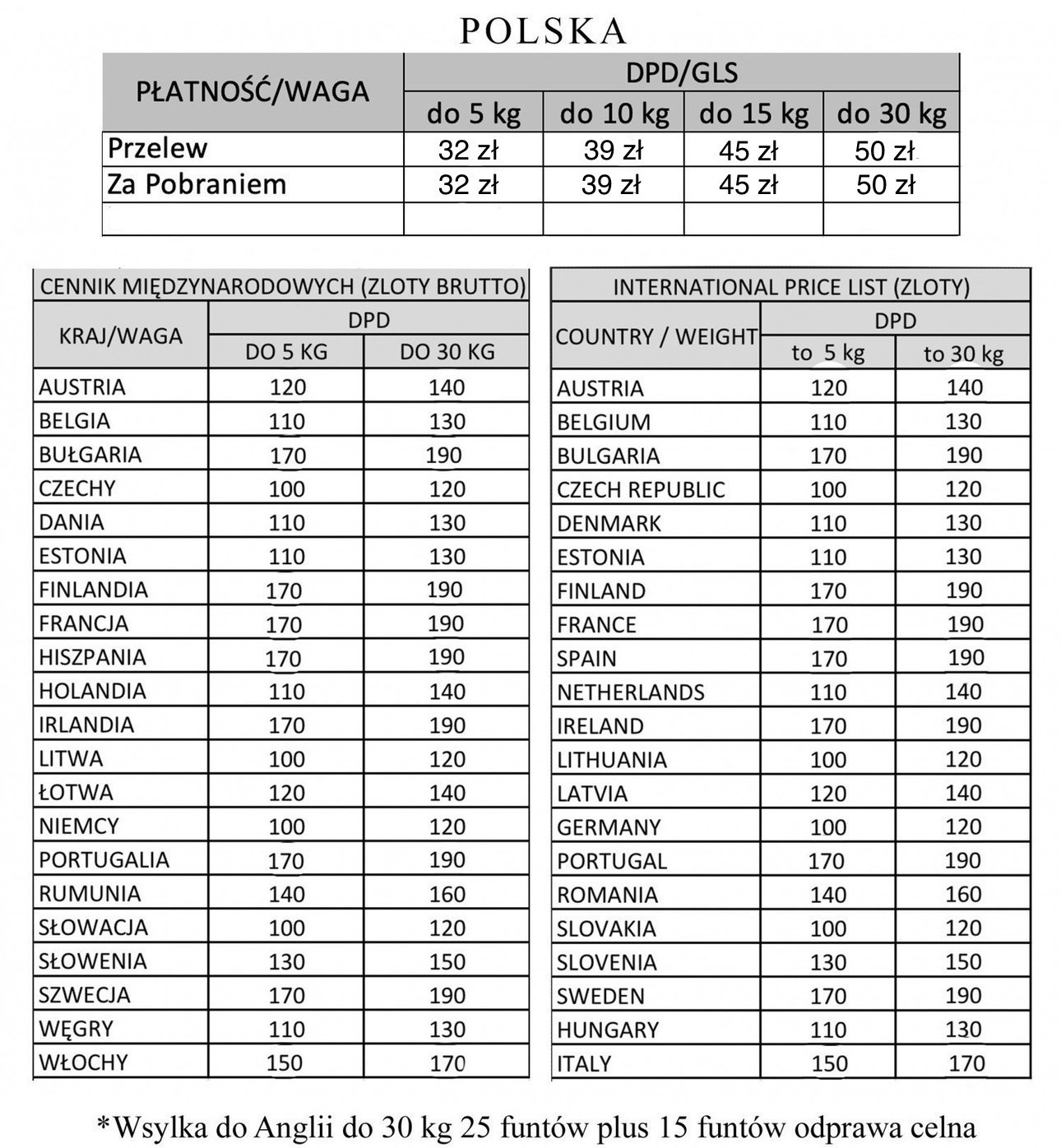 25£ koszt przesyłki di 30 kg + 20£ odprawa celna w PL + 40£ odprawa celna w UK
